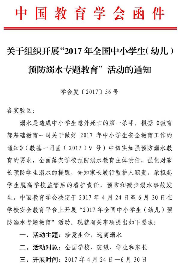 中国教育学会关于组织开展“2017年全国中小学生(幼儿)预防溺水专题教育”活动的通知-凯发平台