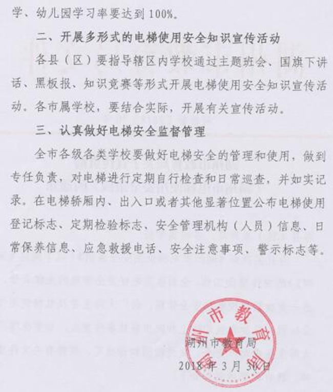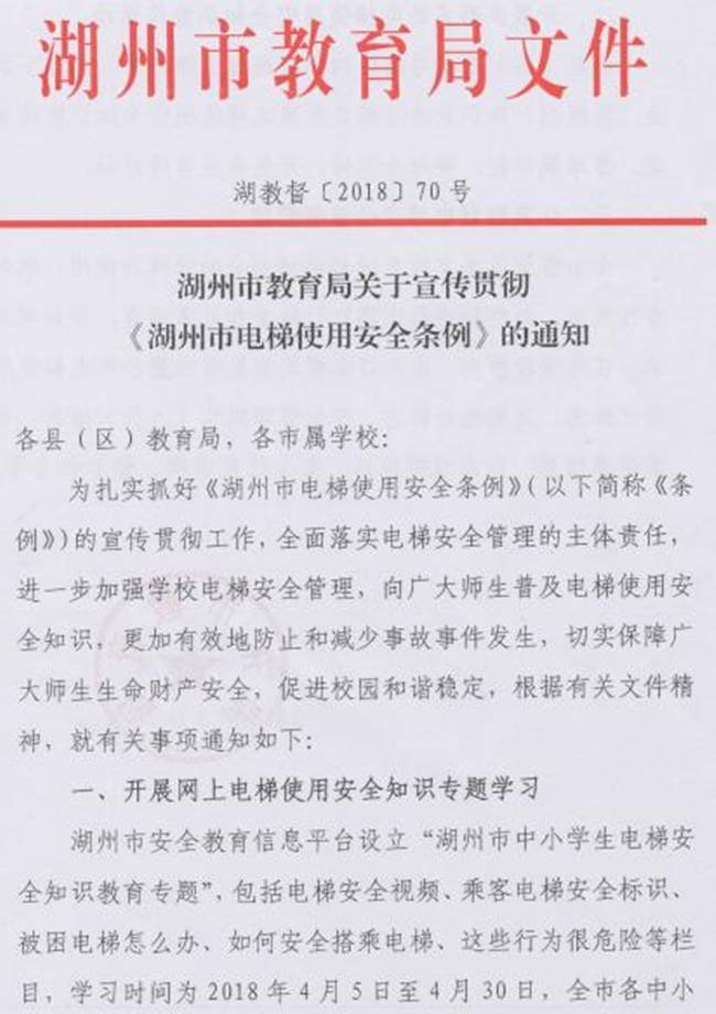 湖州市教育局关于宣传贯彻《湖州市电梯使用安全条例》的通知-凯发平台