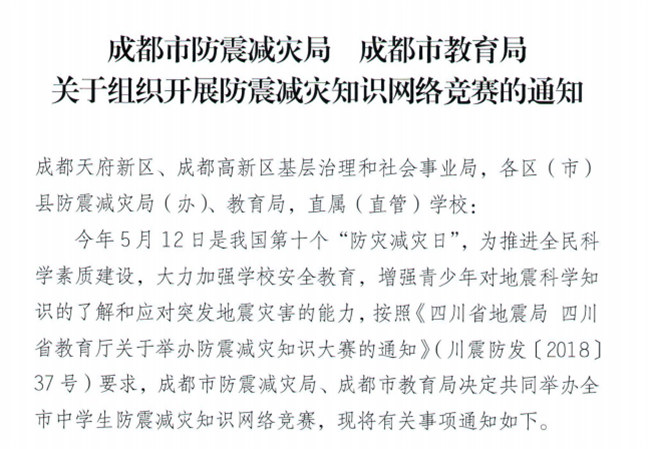成都市防震减灾局 成都市教育局关于组织开展防震减灾知识网络竞赛的通知