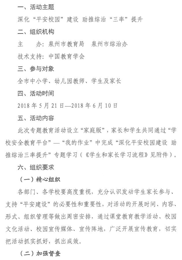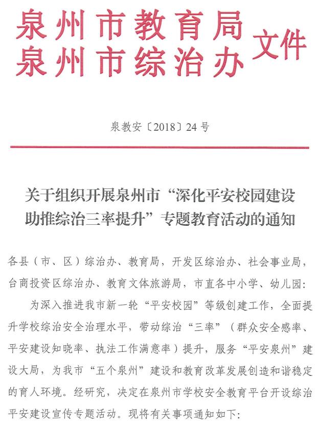 泉州市教育局 泉州市综治办关于组织开展泉州市“深化平安校园建设助推综治三率提升”专题教育活动的通知