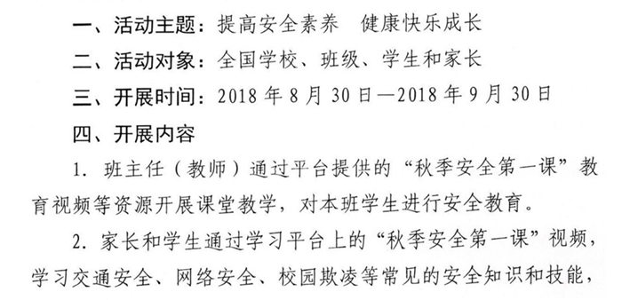 关于组织开展全国中小学生(幼儿)2018年“秋季安全第一课”专题教育活动的通知