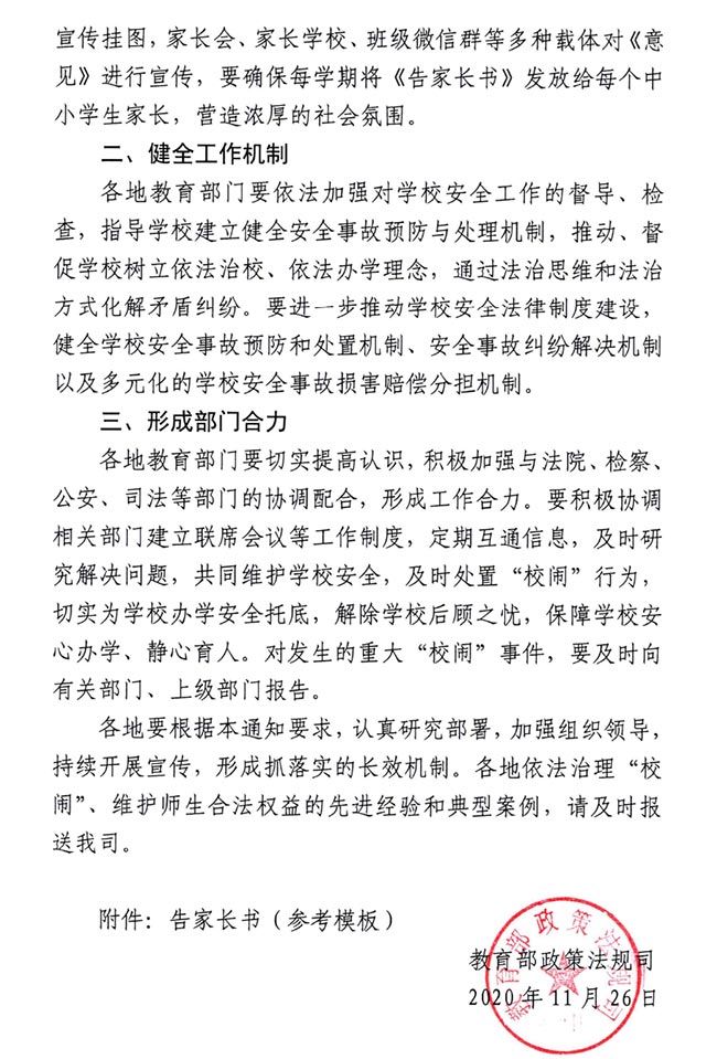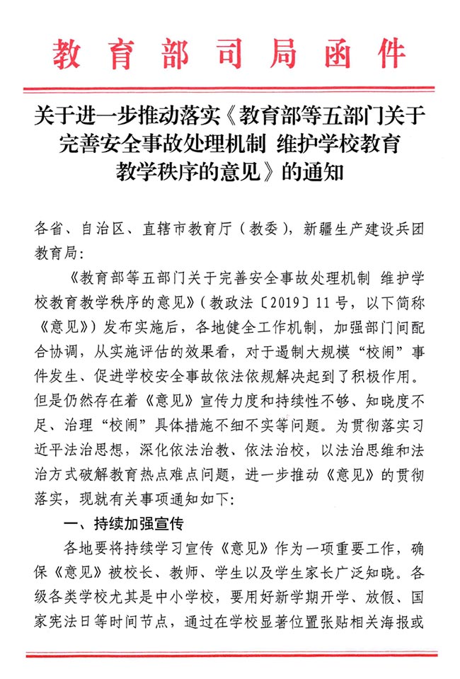 关于进一步推动落实《教育部等五部门关于完善安全事故处理机制 维护学校教育教学秩序的意见》的通知-凯发平台