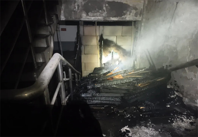 据监控显示,一名儿童使用打火机,多次将点燃的餐巾纸丢入四楼楼梯间,引燃周边堆放的杂物从而引发火灾。