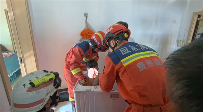 原标题:3岁男童被困洗衣机无法脱身,遵义消防成功解救