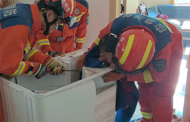 在赶往现场的途中,消防救援人员与报警人沟通得知该男童在家中玩耍时跳入了洗衣机的滚筒中,等家属发现时,男童已困在滚筒内无法动弹。