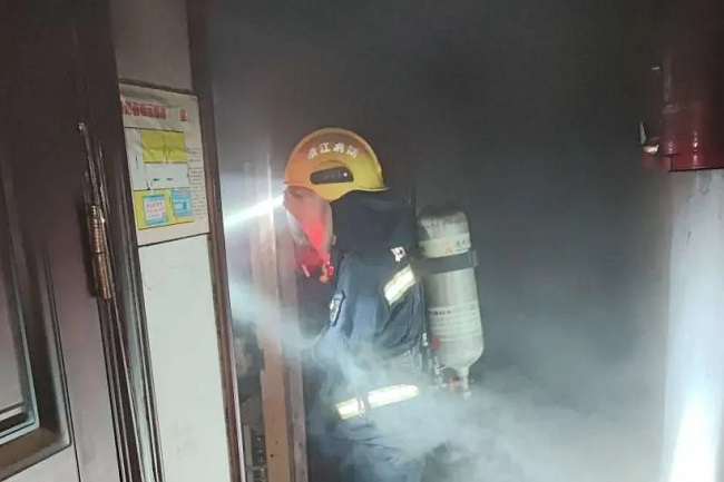 消防员到场时,着火的3楼房屋窗户仍然有大量烟气冒出来。因为了解到屋内有两人被困,其中一名还是婴儿,现场消防员在水枪掩护下即刻全副武装进入楼栋,逐门逐户展开搜救。