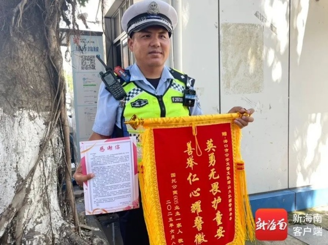 6月10日下午,获救4岁女孩的家人张先生特意将一面写着“英勇无畏护童安 善举仁心耀警徽”的锦旗和感谢信送到海口公安交警琼山大队,以此感谢在关键时刻将孩子“一拎而出”的田冬冬,同时也希望通过媒体感谢所有参与营救孩子的业主和保安。