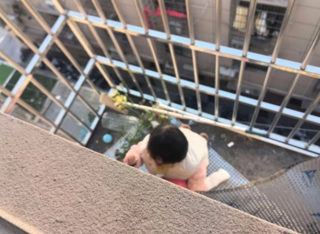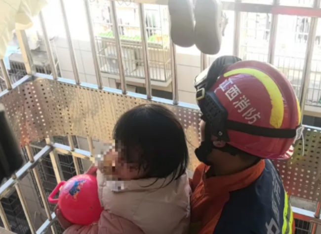 13时18分,消防救援人员到场,经侦察了解发现,家住七楼的3岁小女孩在卧室窗口攀爬玩耍,意外跌落至窗外防盗窗,情形十分紧急。