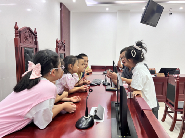 活动中,县法院工作人员带领孩子们来到青少年教育工作室,介绍了工作室创立的背景及工作职能,详细讲解了吸烟、沉迷网络游戏、盗窃财物、辱骂殴打他人等不良行为的危害及违法犯罪的后果,教导孩子如何避免走上违法犯罪道路以及如何更好地保护自己。县法院还为本次活动设置了模拟法庭环节。在法官工作人员的指导下,孩子们进行庭前准备、法庭调查、法庭辩论等工作。孩子们全情投入角色,“零距离”感受法律的庄严神圣。