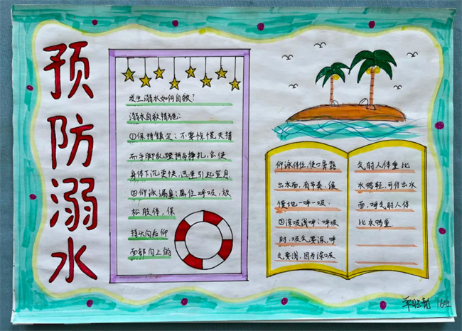 绘制防溺水手抄报。各级各班还组织学生把学习过的防溺水知识用手抄报的形式生动地呈现出来。学生们通过绘制防溺水手抄报,既巩固了防溺水知识,也提高了防溺水意识。