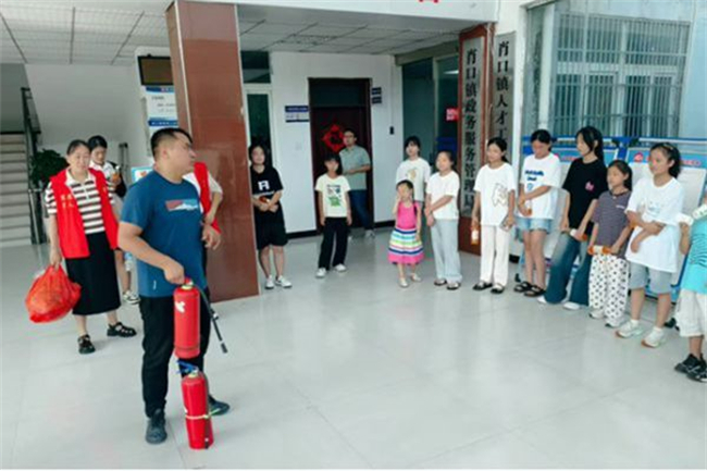 安全演练,共筑屏障。肖口镇阳光驿站志愿者将孩子们带到演练场地开展了灭火器使用实操演练,现场讲解了灭火器的使用步骤以及操作方法,并进行了灭火演示。结合身边常见的案例,工作人员又宣传了夏季用电用火等消防安全知识。孩子们对这种新颖的宣传方式表现出浓厚的兴趣,现场气氛非常热烈。