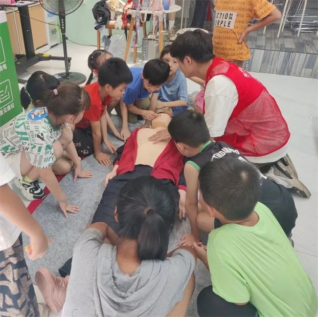 志愿者通过ppt深入浅出地讲解了溺水事故的危害性和预防的重要性,提醒孩子们做到“四个牢记”和“六个不准”。随后,志愿者引导青少年实操急救措施,为青少年儿童暑期安全保驾护航。