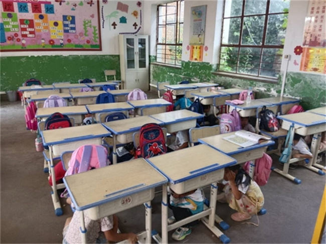 下午3时30分,随着一阵急促的警报声在校园上空骤然响起,防震疏散演练正式拉开序幕。各班级学生在班主任及任课老师的指挥下,迅速采取自我保护措施,双手护头,就近躲在课桌下或墙角等安全三角区内,进行地震发生时的紧急避险。