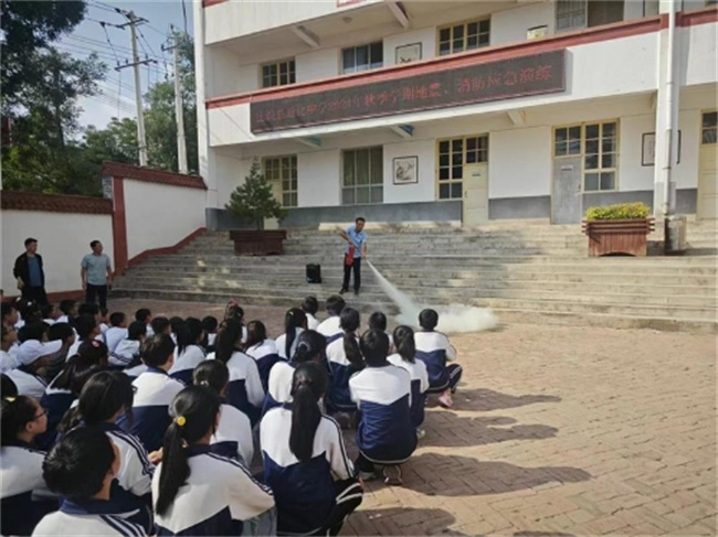 下午16时05分,伴随着紧张急促的警报声,庄浪县通化中学防震和消防疏散演练迅即展开。全体学生弯腰低头,以布遮鼻,如离弦之箭从教学楼楼梯有序撤离到楼前广场的空旷地带。老师吴正军为学生讲解灭火器如何使用。