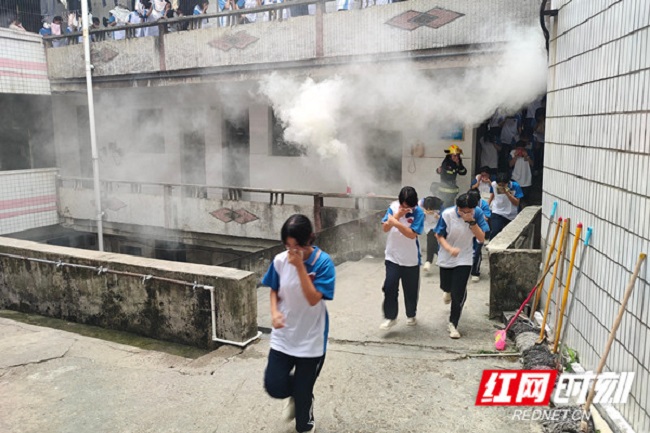 随着警报声响起,演练正式开始。学校第一时间启动紧急避险预案,在教官和消防救援人员的疏散引导下,学生们纷纷伏低身姿,利用衣物捂住口鼻,沿着楼道、楼梯通过各个安全出口,安全、快速、有序地撤离“火灾”现场,到达安全地带。