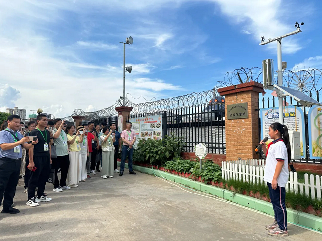 老师梁耀允引领学员们来到了充满科技气息的“星禾”气象站。这个现代化的气象观测设施为学生们提供了一个近距离接触自然科学的平台。气象播报员杨倩雯为学员们介绍了星禾气象站,学生们可以在这里学习到基本的气象知识,还可以通过观测仪器和记录数据分析气候变化趋势。